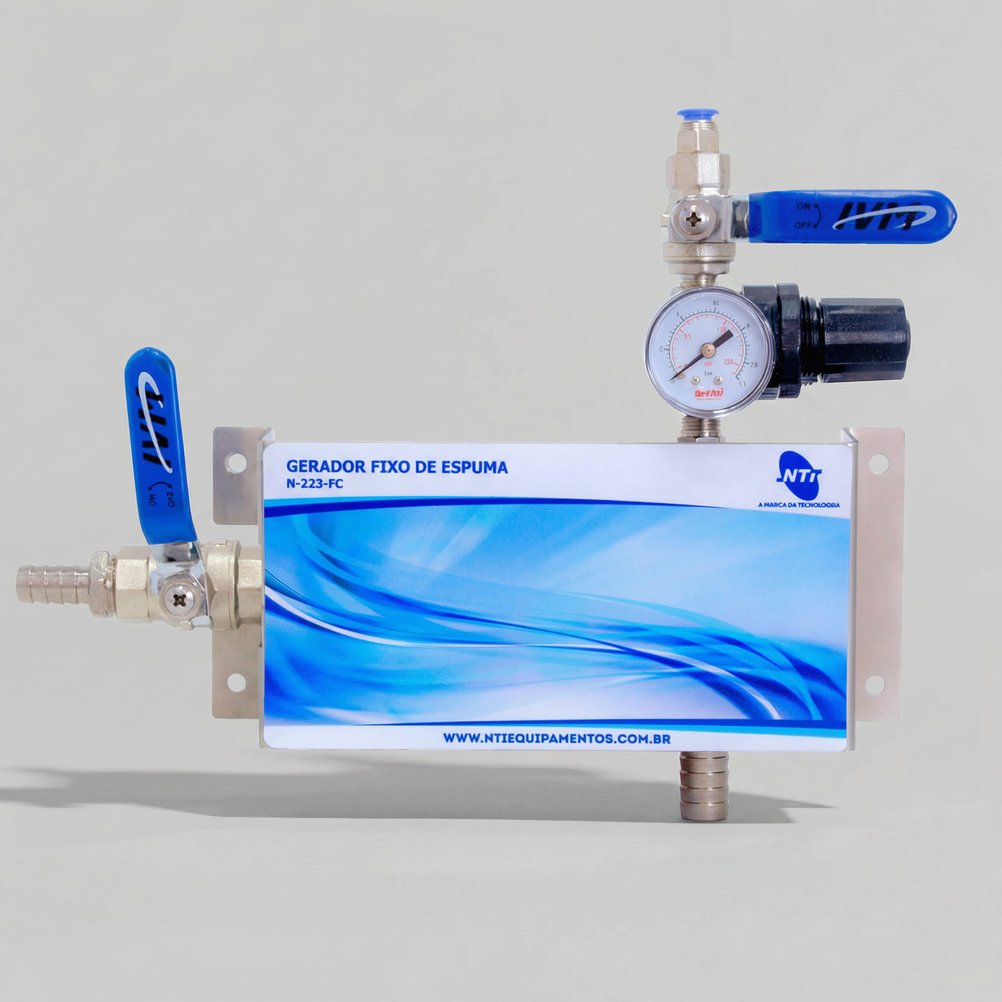 N 223 FC Gerador Fixo de Espuma para 1 (Um) Produto Manômetro para aferição da espuma; Regulador de Pressão na entrada de ar para ajuste da espuma; Suporte para fixação em Aço Inox; Sistema de Venturi para Dosagem do Produto Automático.